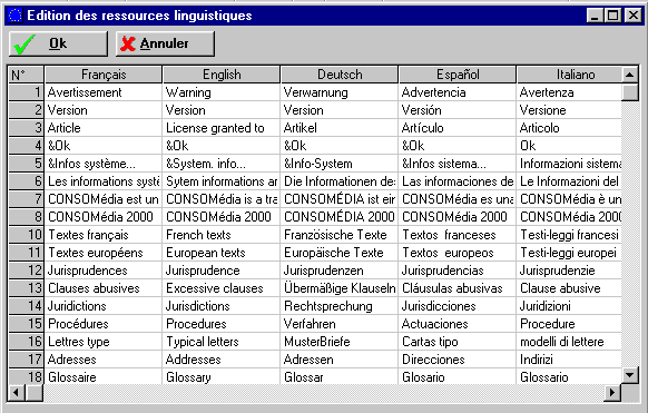 L'application CONSOMédia 2000, l'Éditeur et les différents utilitaires n'incorporent aucun terme linguistique spécifique, mais font référence à une table des termes à employer, chaque terme étant associé à un numéro.